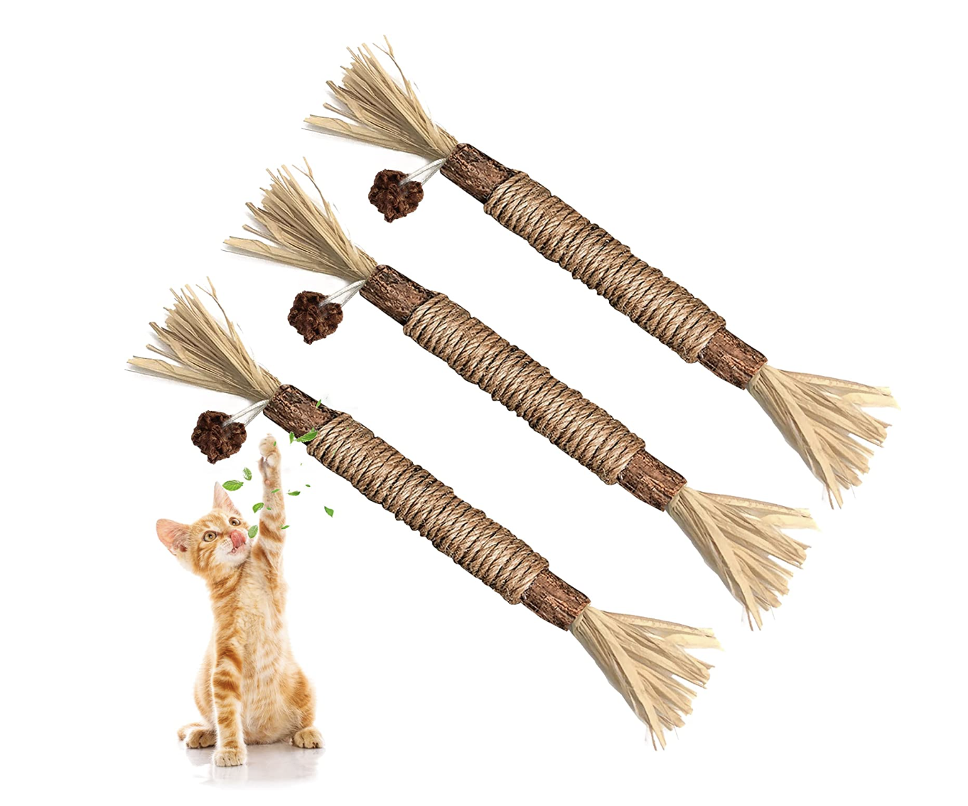 Initially, our cat drooled and drooled, but that stopped after the first introduction. He seems to enjoy these sticks. We’ve had them a couple of months and he’s still interested in playing with them. We leave them on the floor and find them moved around to different places. The product Is organic and not harmful. I don’t have any way to know if they helped clean his teeth because he needed dental work and extractions recently that also included plaque removal. He is 10 years old.