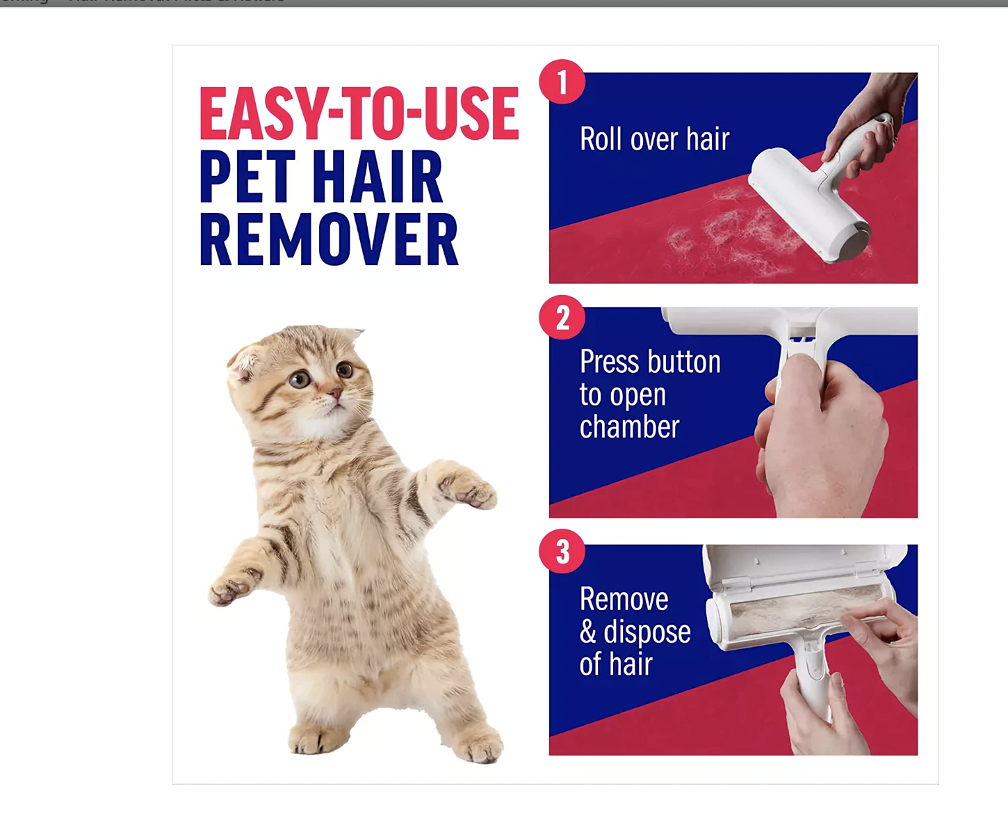 A good hair clean up tool. You brush whatever pet hairs you find on clothing and sheets, and the remover picks it up. You press the button on the front to open the inside, and can scoop out the pet hairs into the trash. This remover is ok but not the best for short haired pets or thin sheets. It seems to struggle getting some of the hairs under those circumstances. Removing the hairs inside the chamber is easy but the brush can still have some stuck on it that you have to manually remove. Works well for what it is, just keep in mind its limitations.