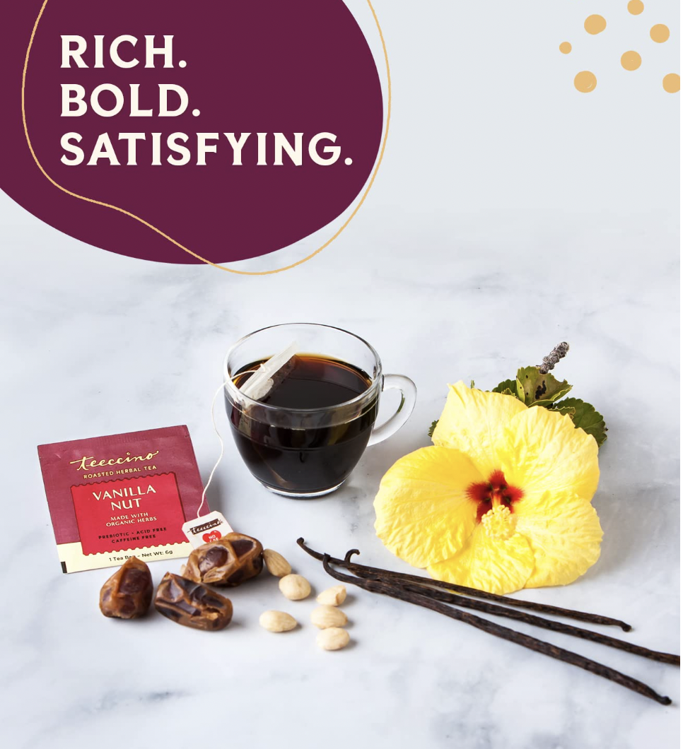 Teeccino Herbal Tea is a delightful caffeine-free and acid-free coffee alternative made from roasted chicory, almond, and prebiotic ingredients, infused with a rich vanilla nut flavor, and conveniently packaged in 10 tea bags per pack, offering a total of 60 tea bags in this value pack.